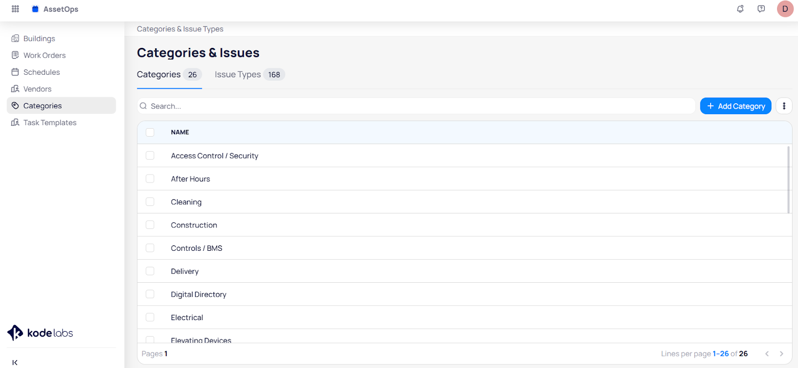 On the Categories module, you have a set of Categories and Issue Types that you can use to organize and categorize your work orders. You can also create new categories and assign issue types to different categories based on your use cases.