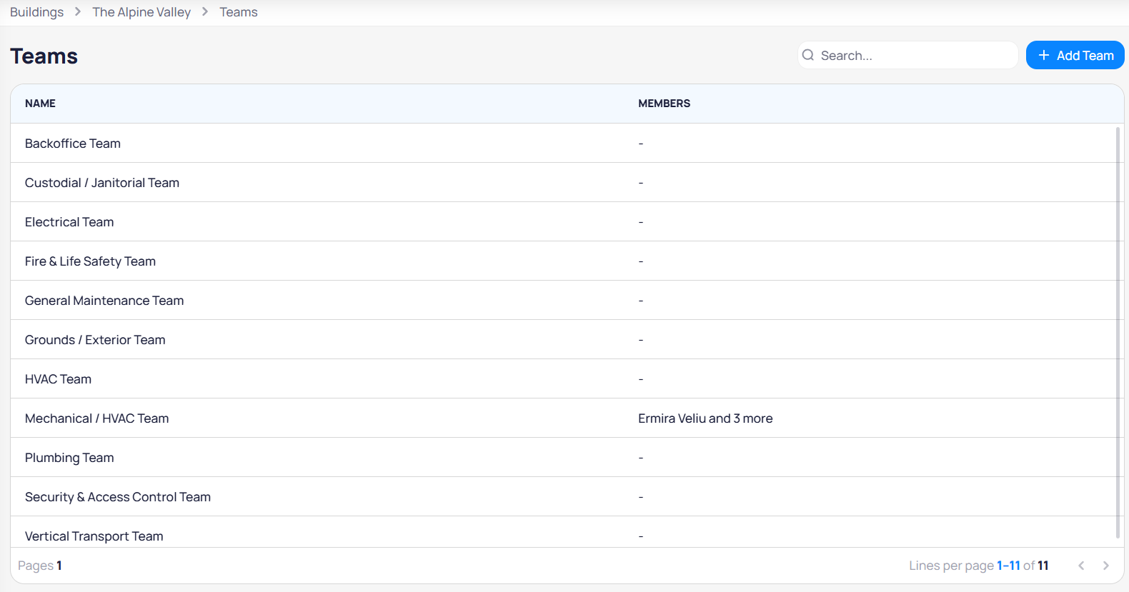 Teams: Represent groups of people responsible for handling specific types of tasks or managing certain building systems. Each team can be assigned to one or more work orders based on their role, expertise, or area of responsibility.