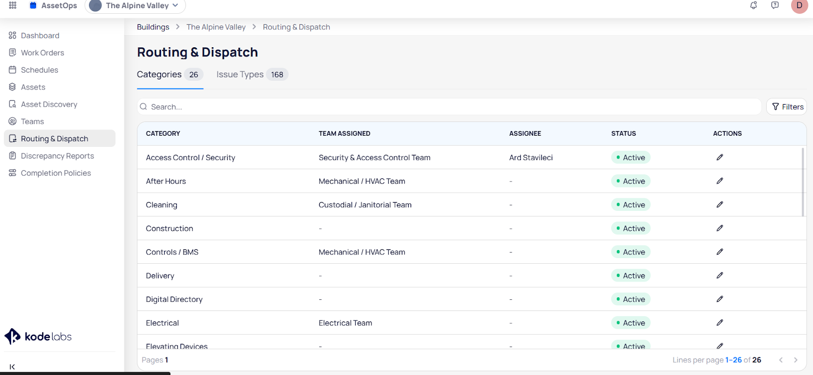 Categories and issue types can be edited to change team or user assignments, providing flexibility as building operations and responsibilities evolve.