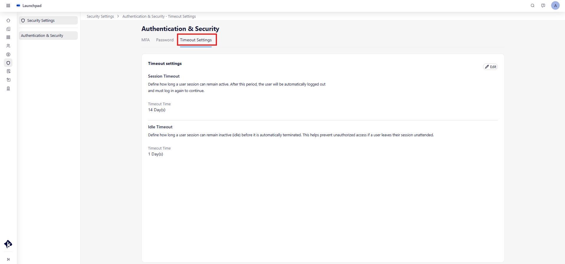 The Authentication & Security panel is available via Security Settings. There are three tabs: MFA, Password, and Timeout Settings.