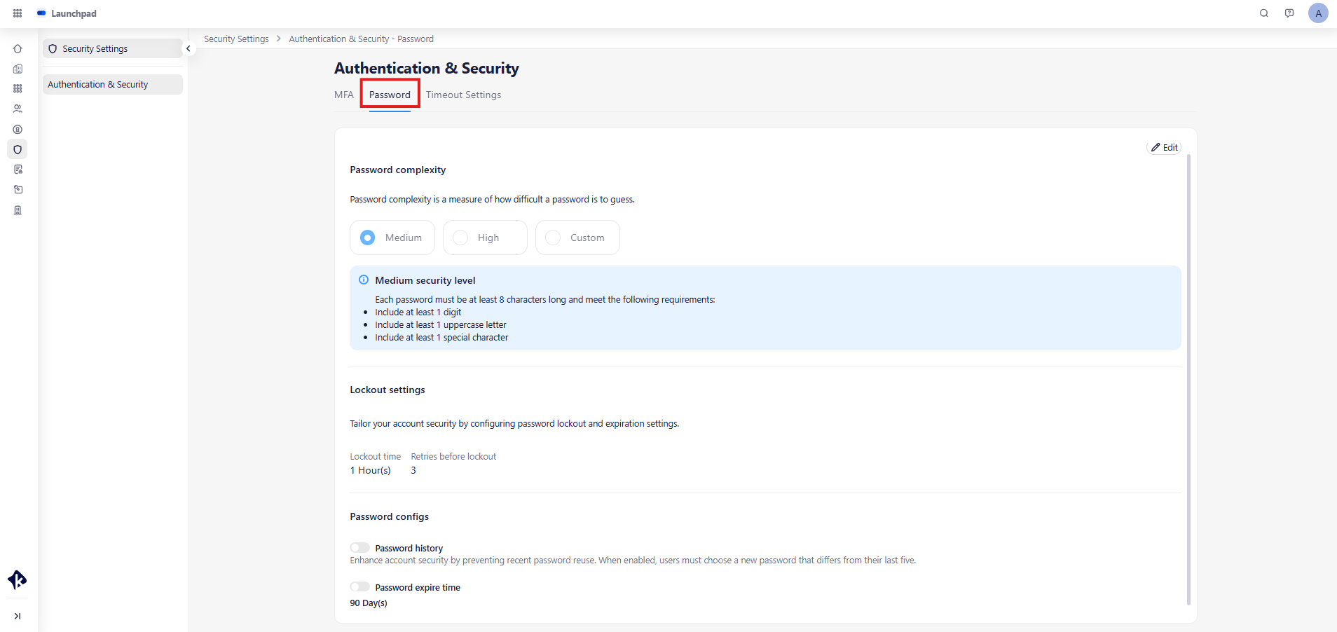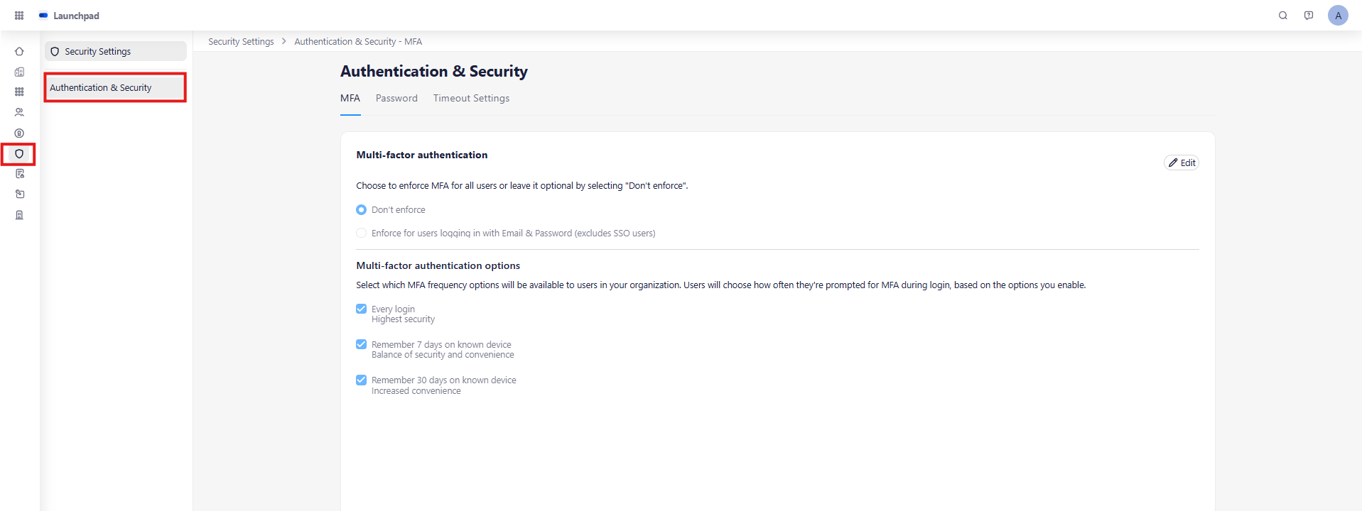 Enabling and customizing MFA adds an extra layer of security by requiring users to provide a second form of identification. To view the MFA settings, select Security Settings > Authentication & Se