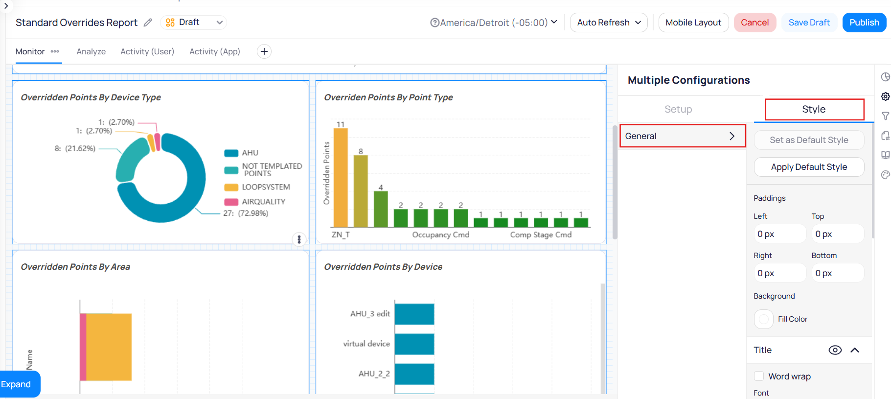 If you select multiple widgets of different types, only general styles are available. This prevents conflicts between incompatible settings while still allowing you to maintain a consistent dashboard look.