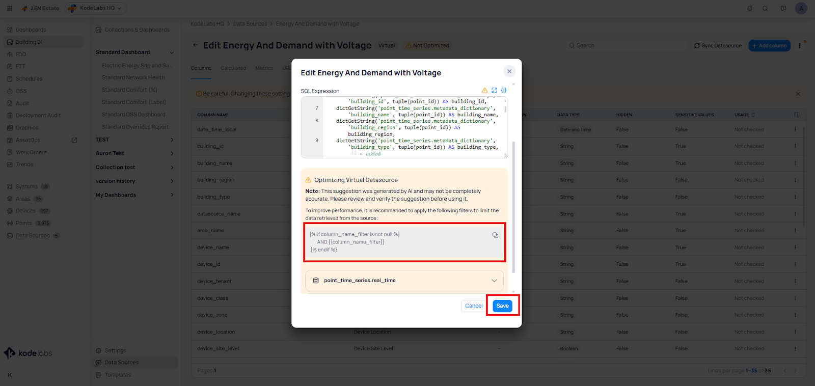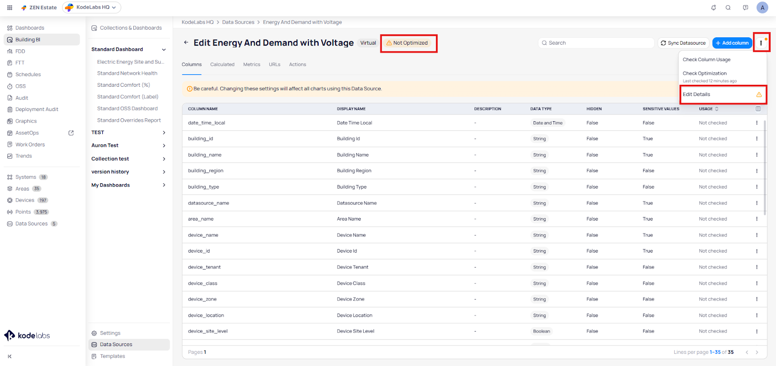 Select the Data Source you want to optimize (e.g., Energy And Demand with Voltage).