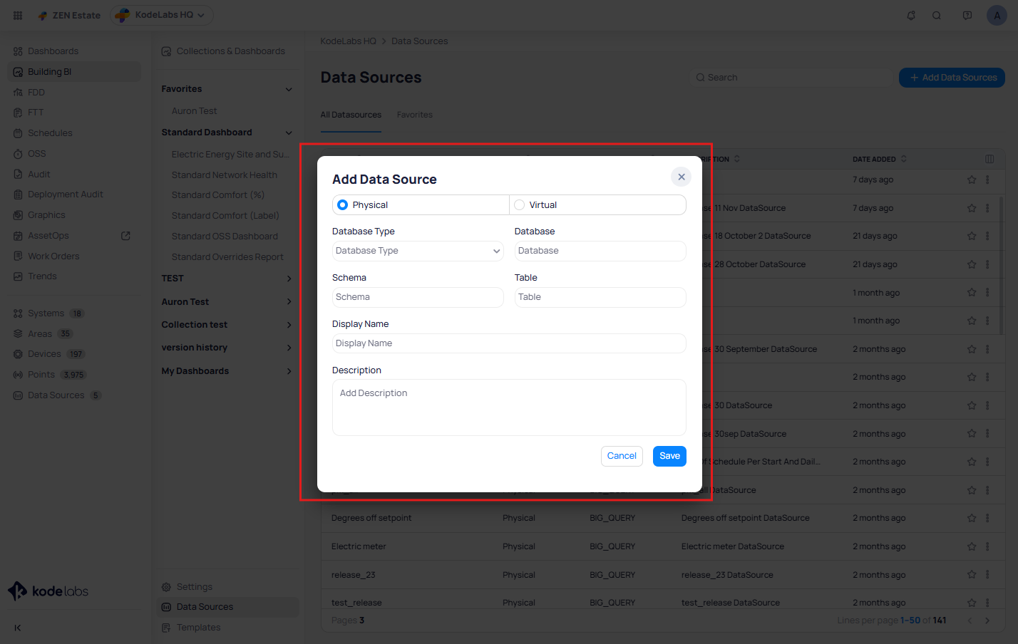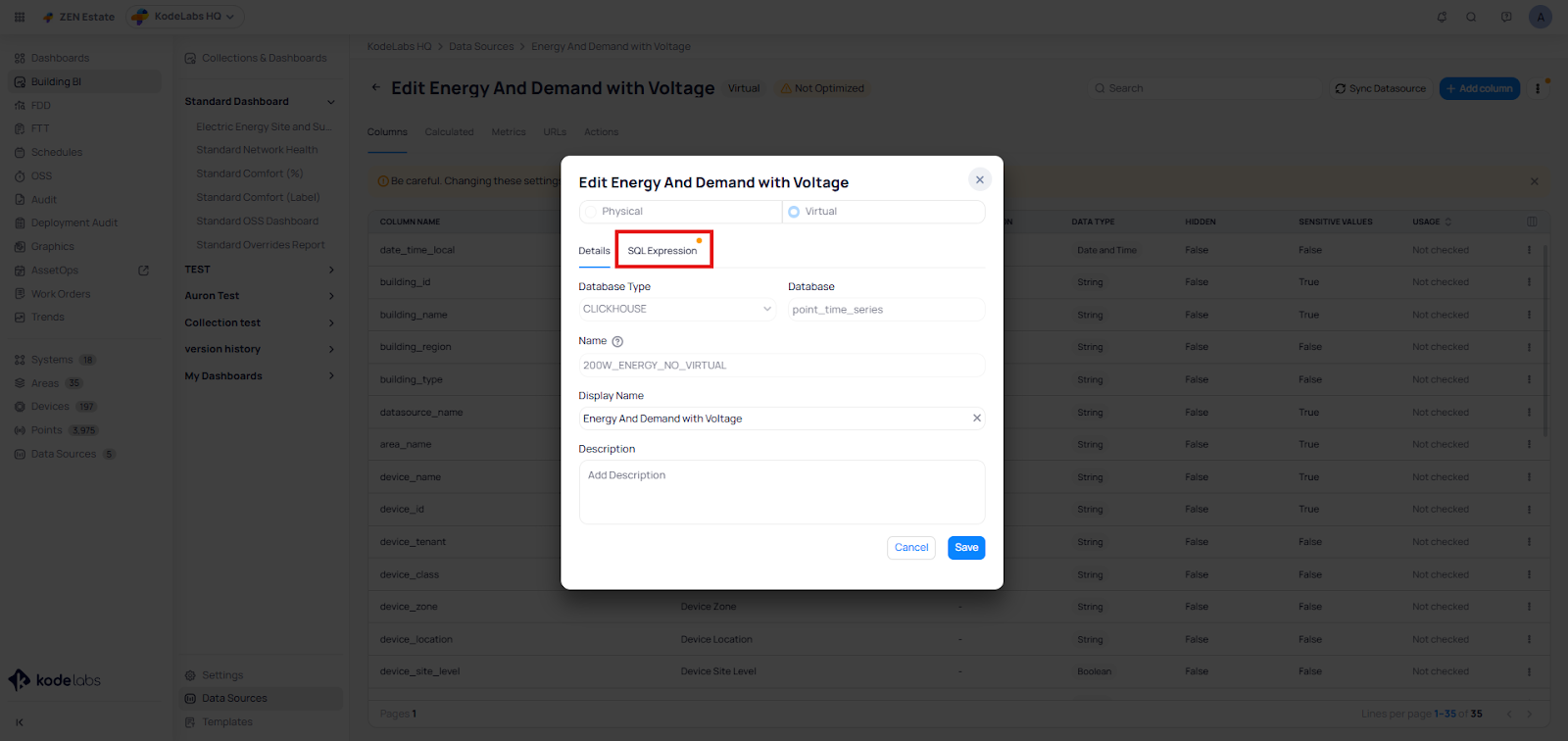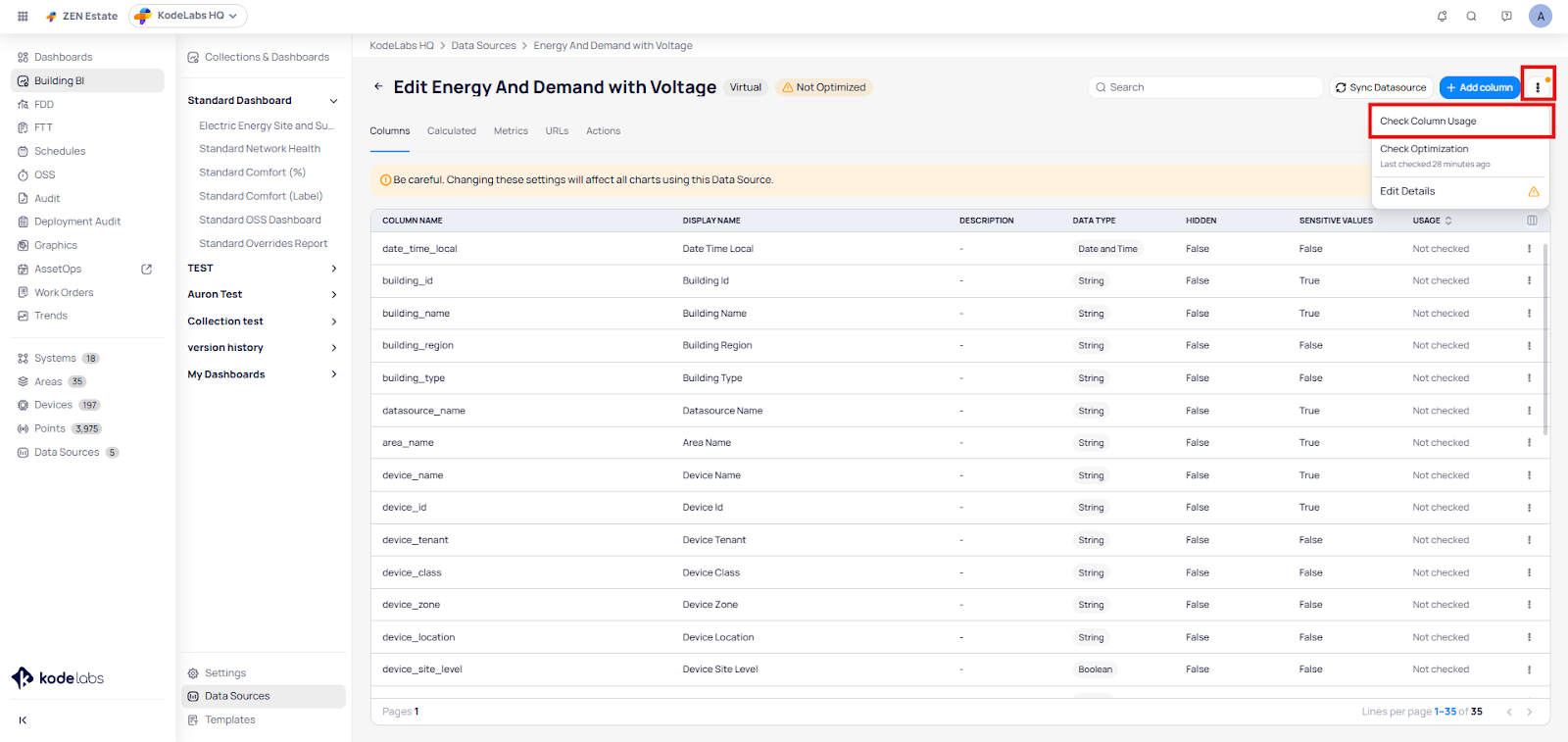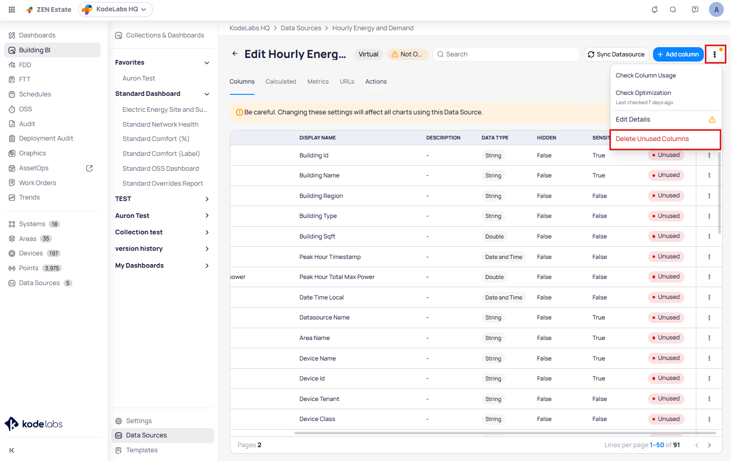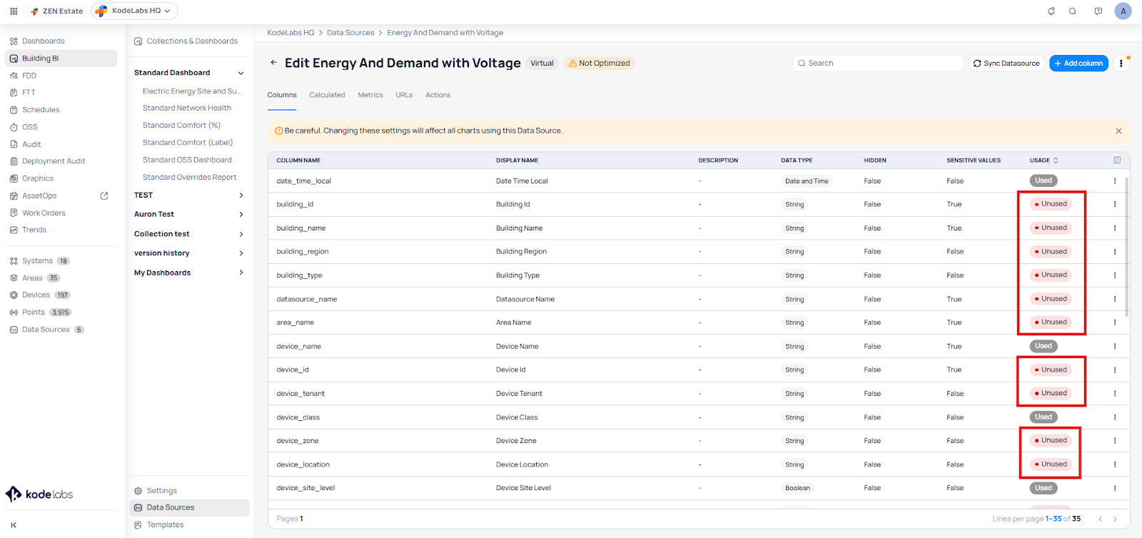 The Data Source feature in Building BI allows you to view and edit the sources used for metrics, SQL scripts, and other calculations. Every Data Source provides a variety of Columns that can be used in metrics, filters, and other dashboard logic.