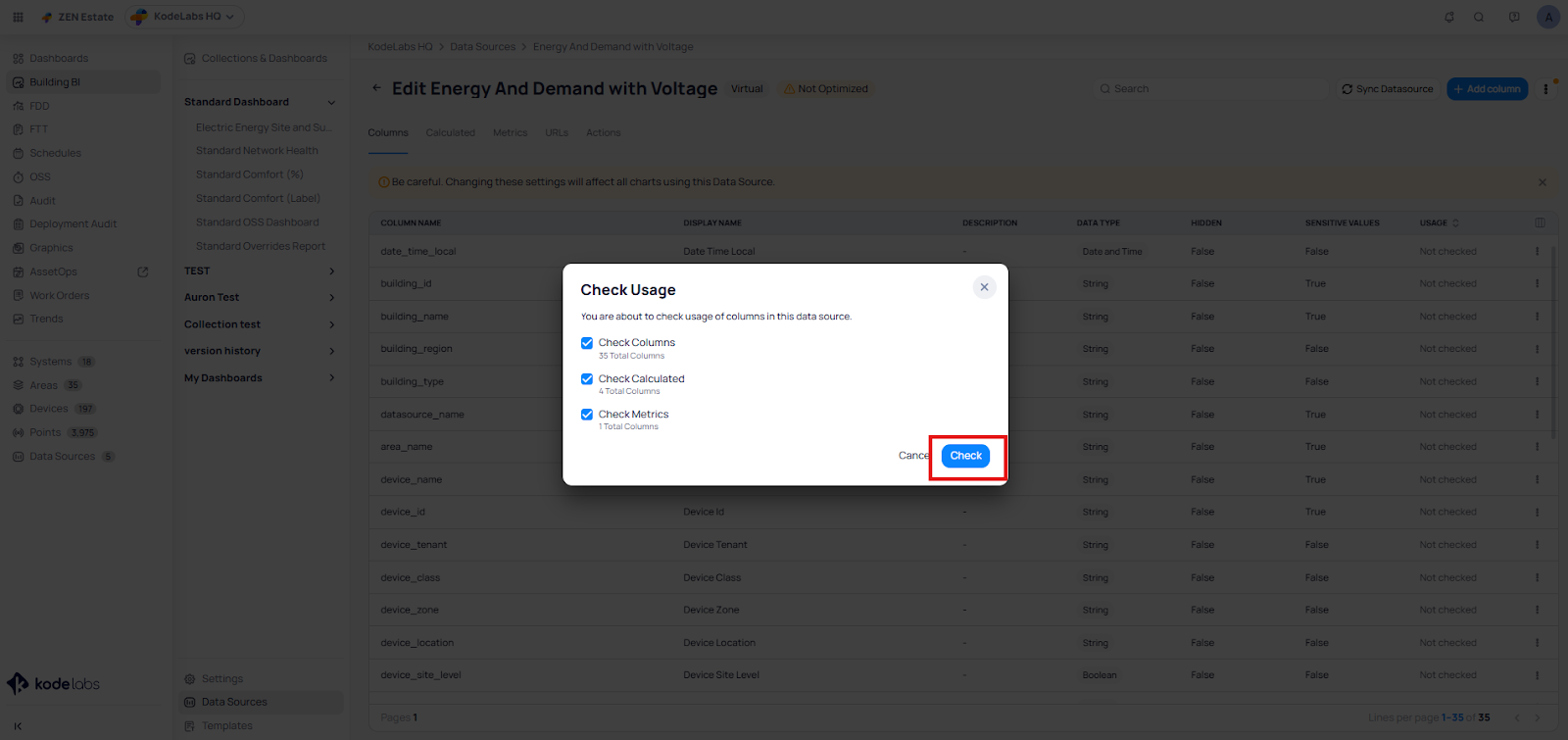 A window will pop up showing all columns, including calculated fields and metrics. Click Check.