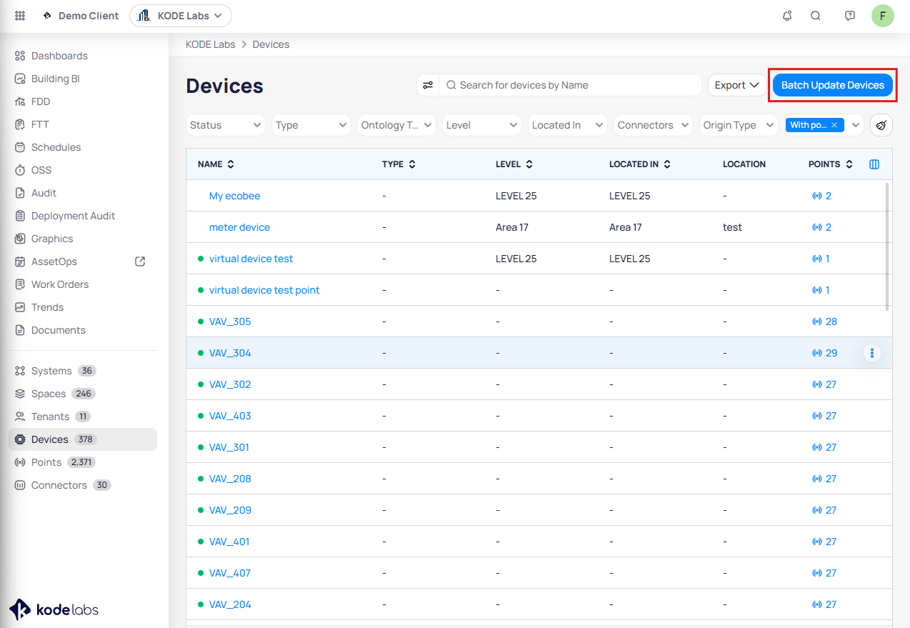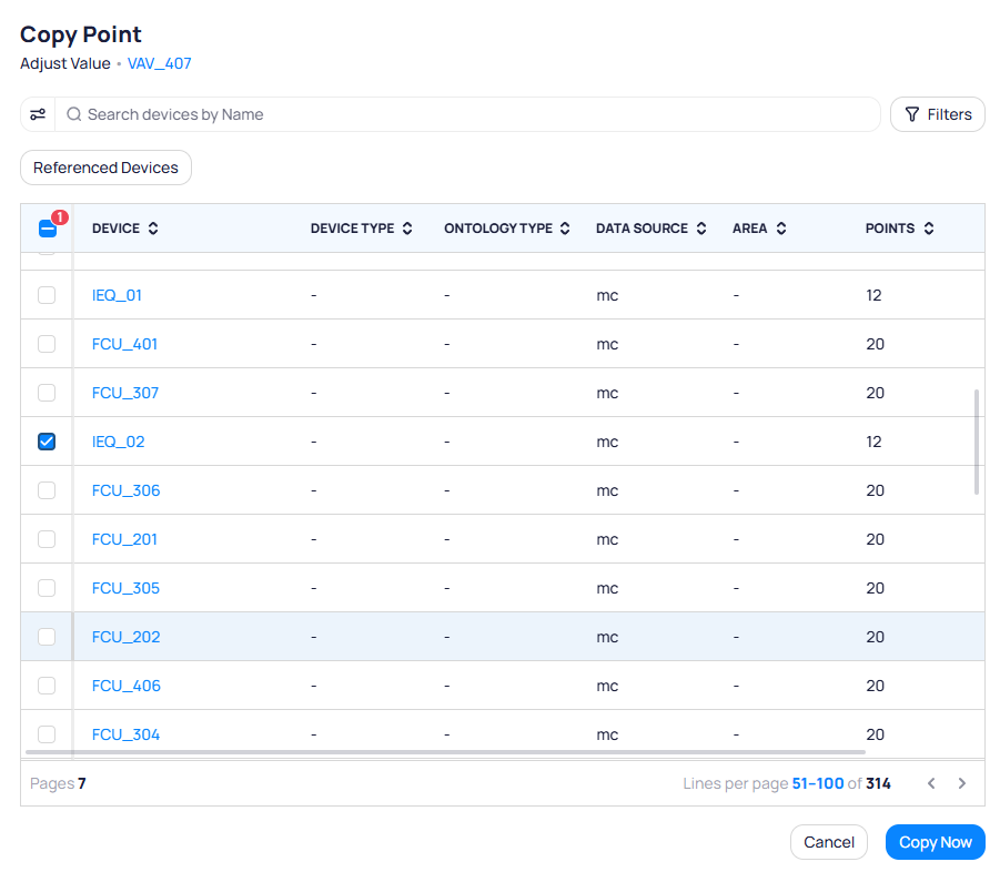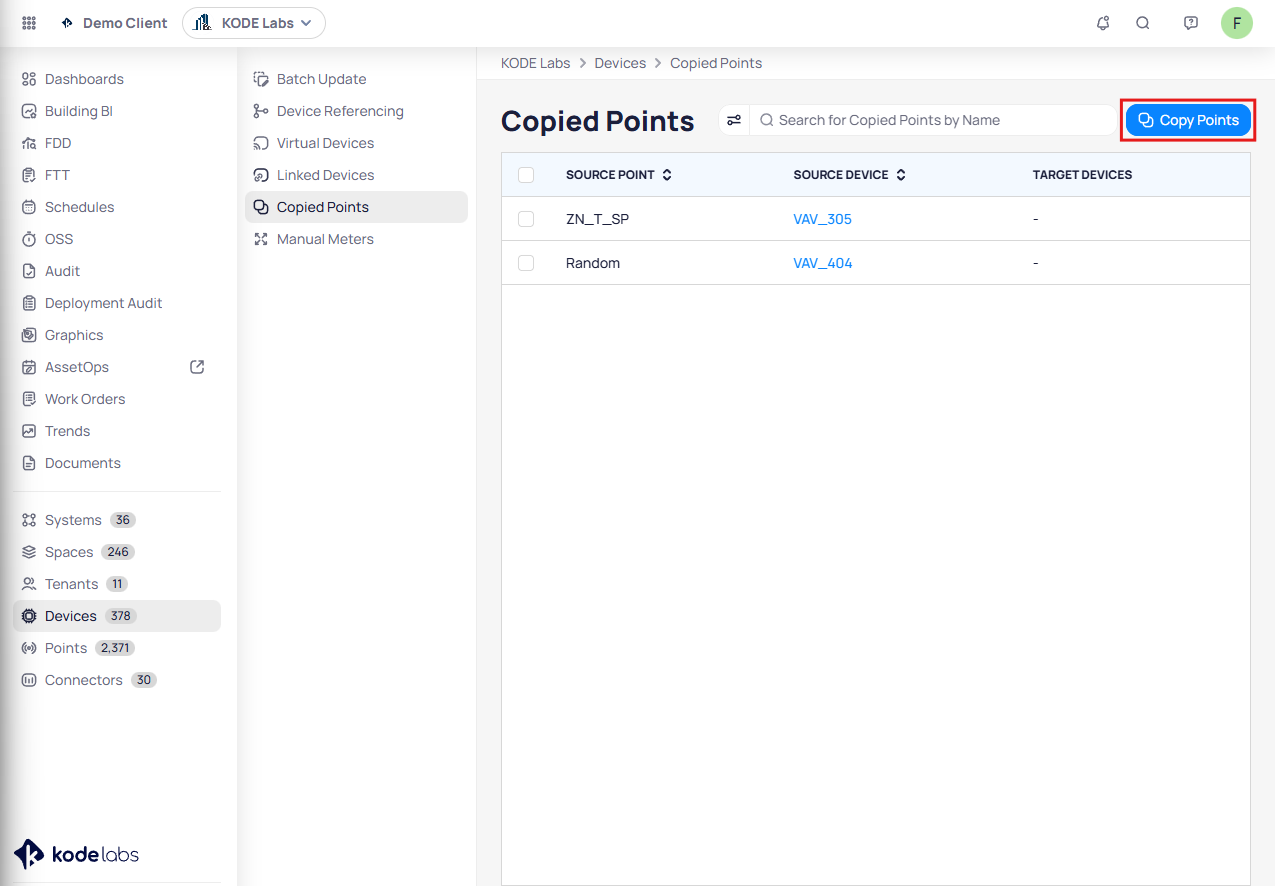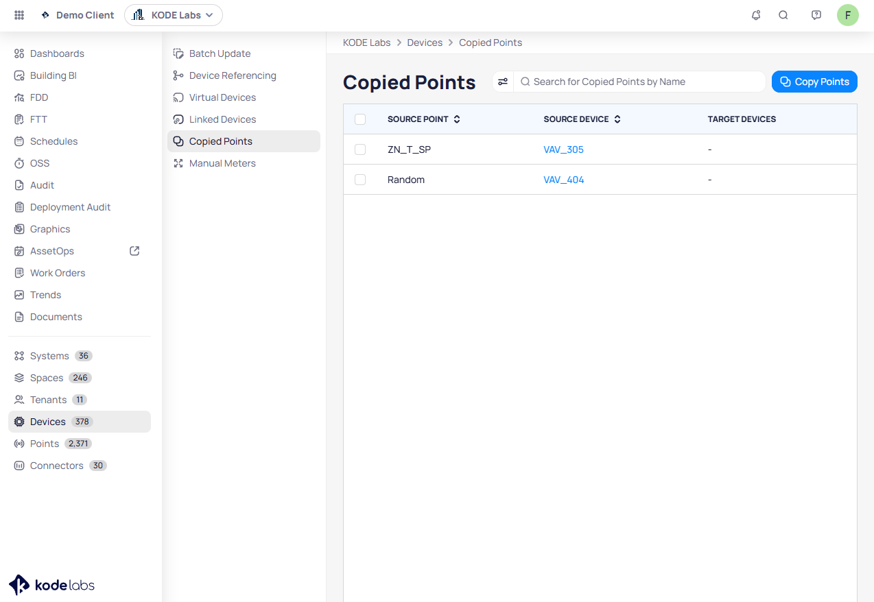 The Copy Points functionality is available in the Devices module under Batch Update Devices.