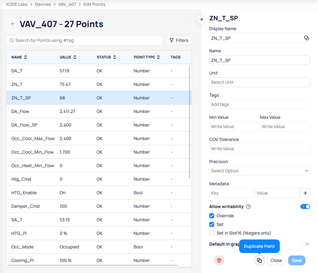 Duplicating points allows the same point (for example, a setpoint or sensor) to be shared across multiple devices. Common use cases include shared sensors, shared setpoints, or major water systems. Unlike moving points on virtual devices, duplicating points ensures the point remains available on both the source and target devices.