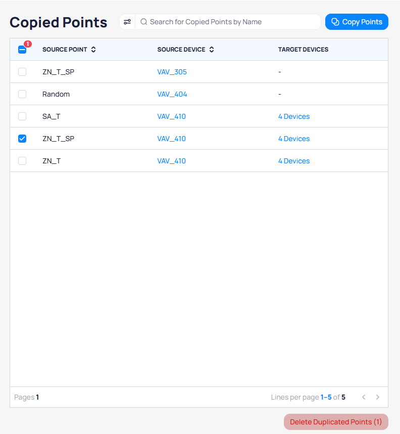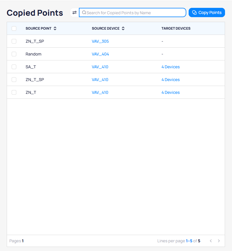 The Copied Points page also serves as a history of all copied points within a building. From this page, you can view: