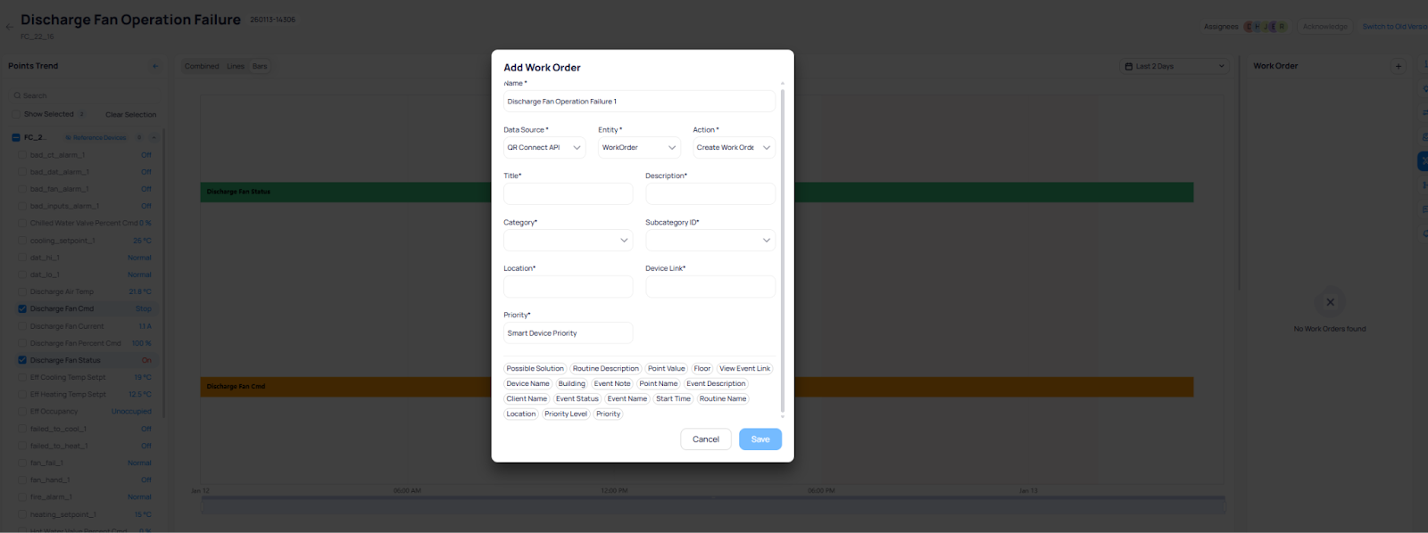 Displays any work orders linked to the event. Here, you also have the option to create new work orders by clicking the “+”.