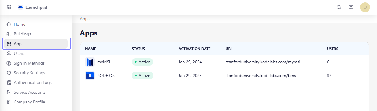 Apps display all the possible products and/or features that are provided under the KODE OS umbrella, along with information on their access status, activation date, and the number of users currently using each product or feature.