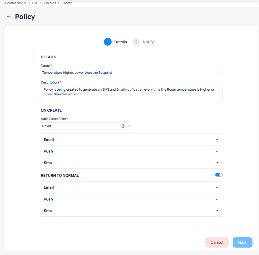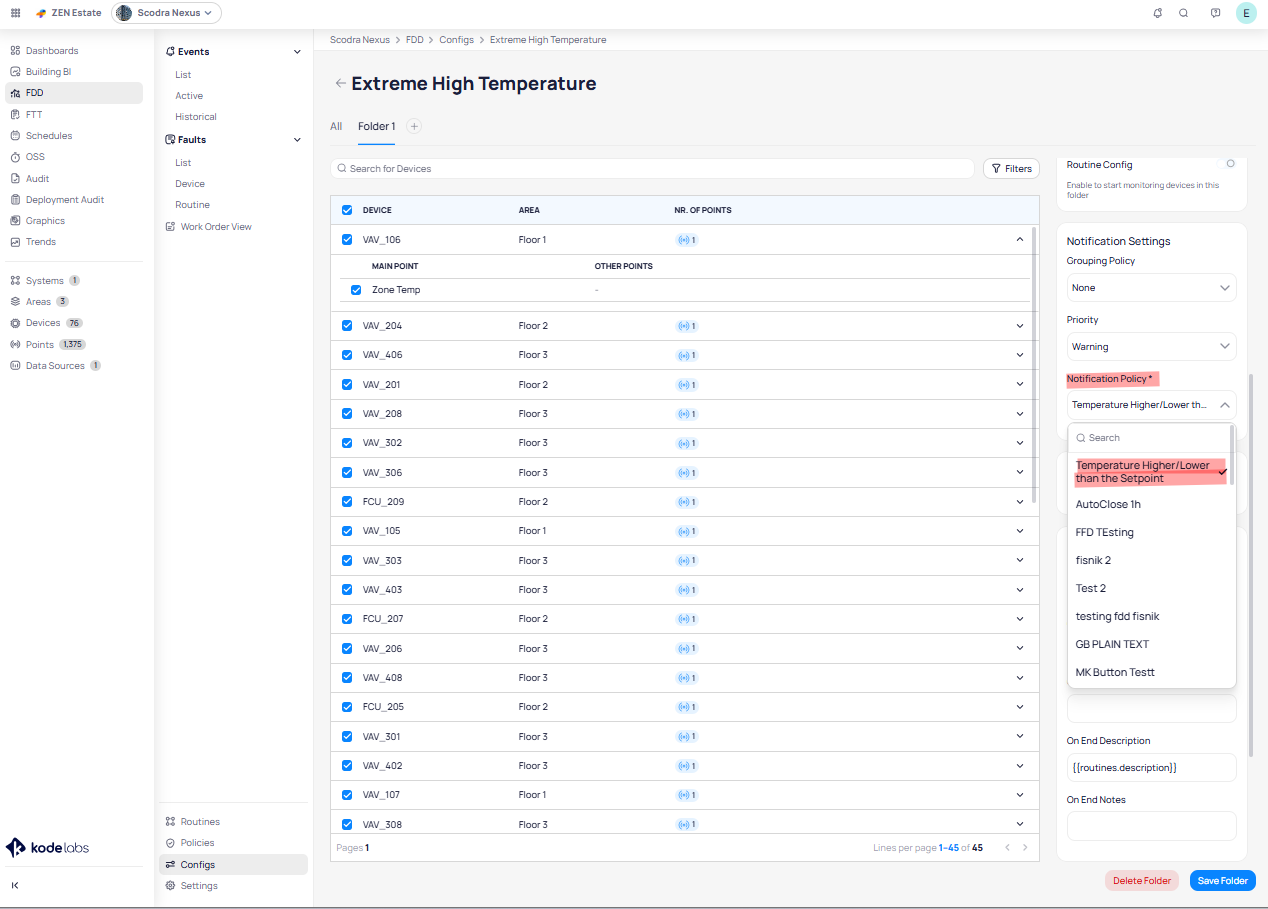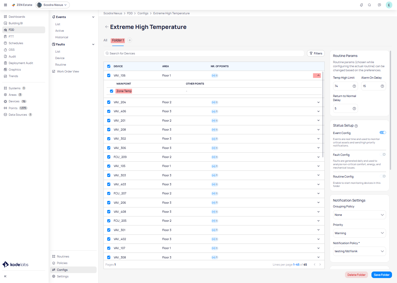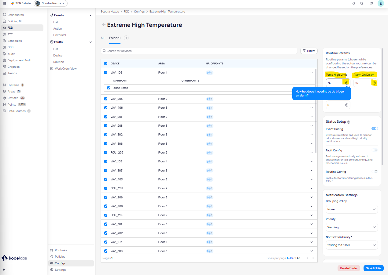 If you want to receive a notification when your room temperature goes above 74°F or below 68°F, you’ll need to create and configure a Notification Policy in KODE OS. This policy will manage how alerts are sent via email and SMS when an FDD alarm is triggered.