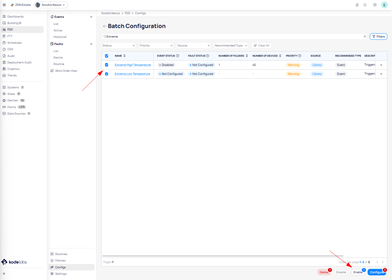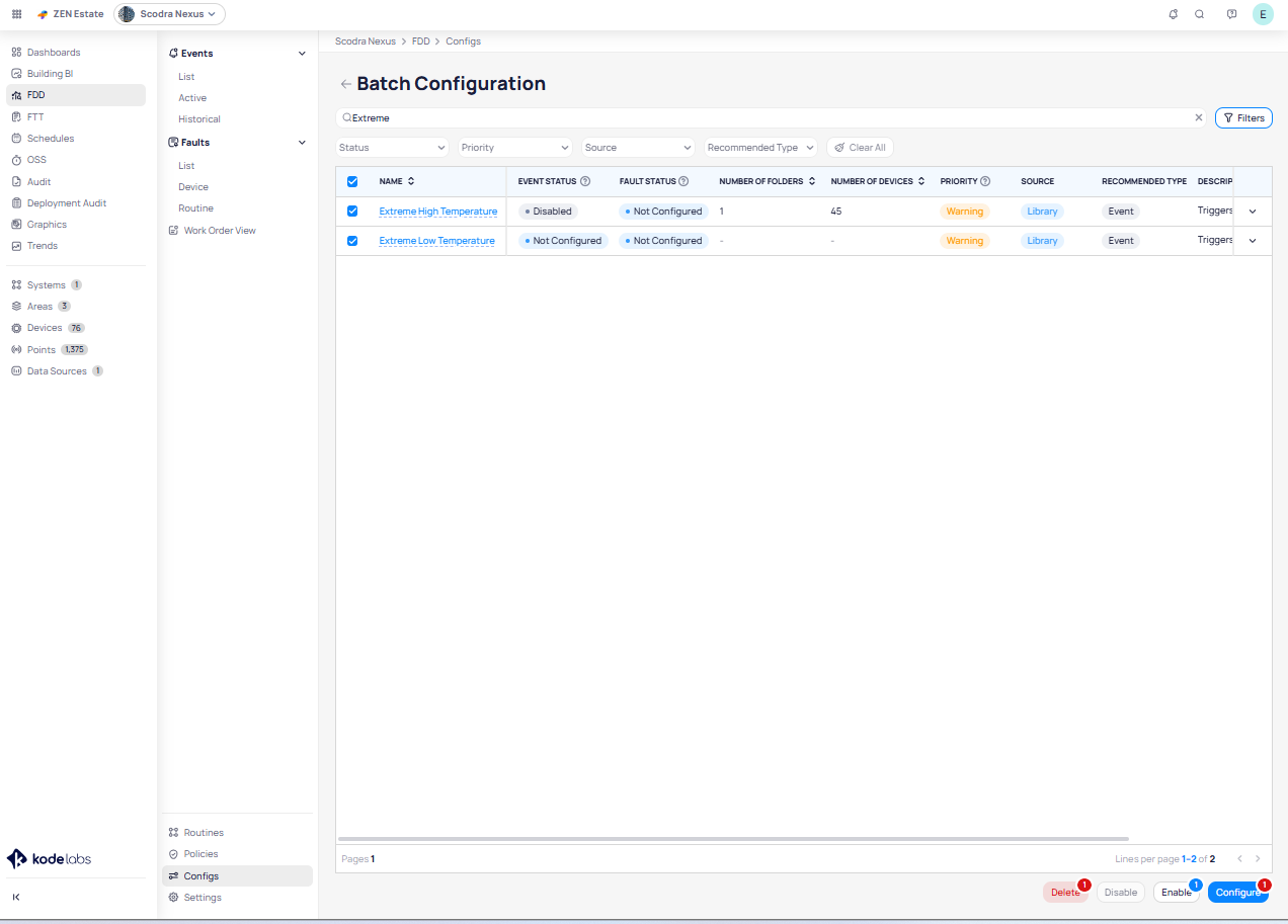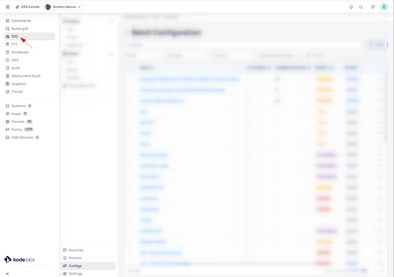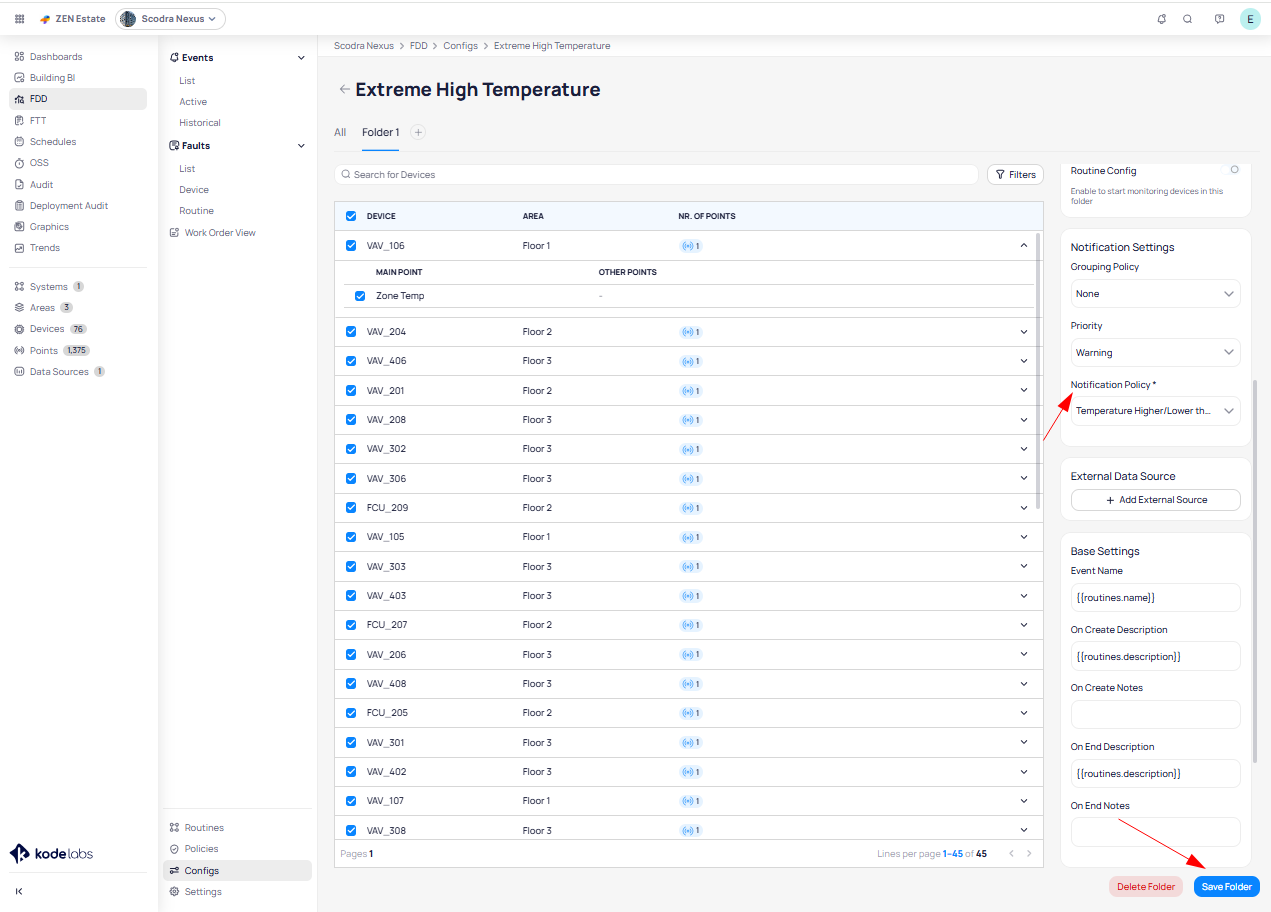 Once access is granted, you can configure the new FDD alarm. KODE comes with a ready-to-use FDD library covering heating, cooling, mechanical systems, network connectivity, energy, air quality, and more. The library includes rules ranging from simple BMS alarms and equipment failures like chillers, boilers, pumps, and fans, to advanced rules for energy and operational efficiency.