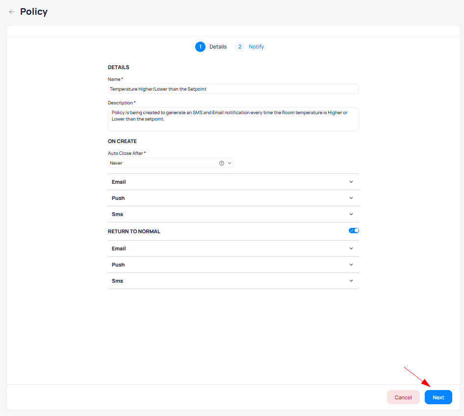 Name: Choose a name that clearly describes the purpose of the policy (for example, “Room Temperature Alert”).