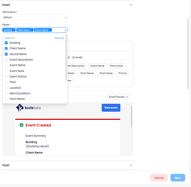 Down here you decide how you want to receive alerts once an alarm is triggered, the template on each notifications type. KODE OS offers three notification types: Email, Push, and SMS.